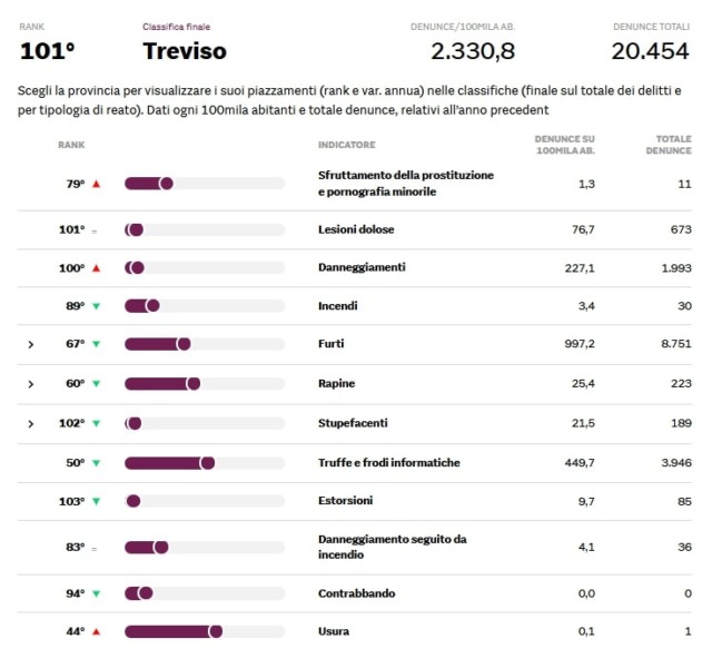 A livello regionale, la provincia di Treviso si conferma la più sicura del Veneto. In testa troviamo Venezia, che è nella top ten della classifica nazionale.