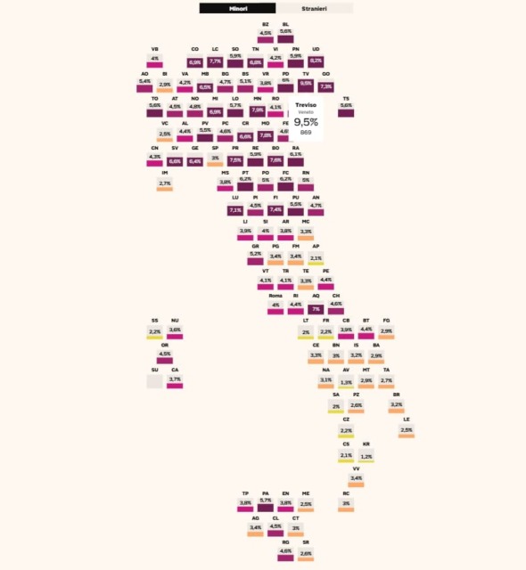 A Treviso, in particolare, la situazione appare più grave che altrove, segno di un disagio giovanile crescente e di un possibile indebolimento dei meccanismi di prevenzione e controllo sociale. Subito dopo la Marca si collocano Udine (8,2%) e Mantova (7,9%), mentre le province con le percentuali più basse di minori coinvolti risultano Crotone e Avellino (1,2%), seguite da Napoli (3,1%).