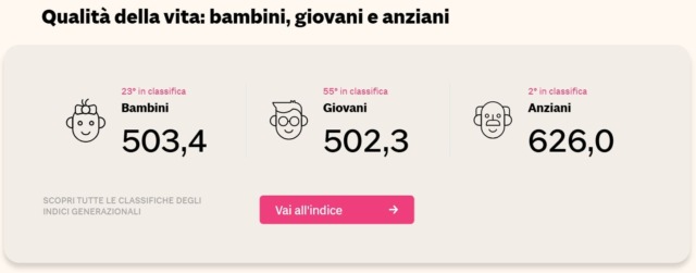 Una parte degli indicatori è composta da indici già pubblicati durante l’anno dal quotidiano: dall’Indice del Clima agli Indici Generazionali (bambini, giovani, anziani), dall’Indice di Sportività a quello della Criminalità, fino a Ecosistema Urbano e alla Qualità della vita delle donne.