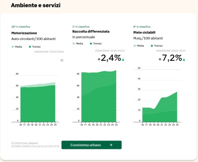 Un altro fiore all’occhiello di Treviso è la qualità dell’ambiente e dei servizi: nella classifica specifica “Ambiente e servizi” la provincia si posiziona al 2º posto nazionale. Questo è il risultato di ottimi indici su vari sotto-parametri, tra cui la raccolta differenziata (spesso ai vertici nazionali), l’adozione di energie rinnovabili come il fotovoltaico, e servizi urbani e ambientali curati.