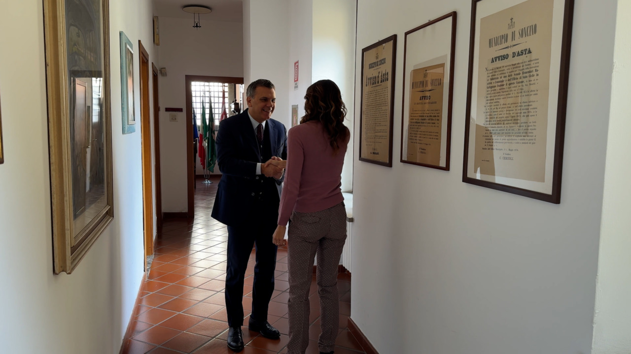 Il nostro viaggio di scoperta di Soncino parte dal palazzo del municipio con l’alta torre civica, simbolo del borgo medievale: costruita nel 1128 come struttura a base quadrata e innalzata a 42 metri nel tardo 1500 con l’aggiunta della cella campanaria, fu in passato anche prigione, oggi visitabile grazie ai lavori di restauro che l’hanno restituita alla cittadinanza. Il frontone della facciata del Palazzo Comunale, ricostruita a seguito del terremoto del 1802, è sormontato dalla torretta con un orologio a percussione, costituito da due piccoli mori che battono con un martelletto su una campanella, testimonianza del periodo di dominazione veneta su Soncino. Si tratta, infatti, di una riproduzione, in scala ridotta del celebre orologio di piazza San Marco. Qui la nostra giornalista incontra il sindaco Gabriele Gallina.