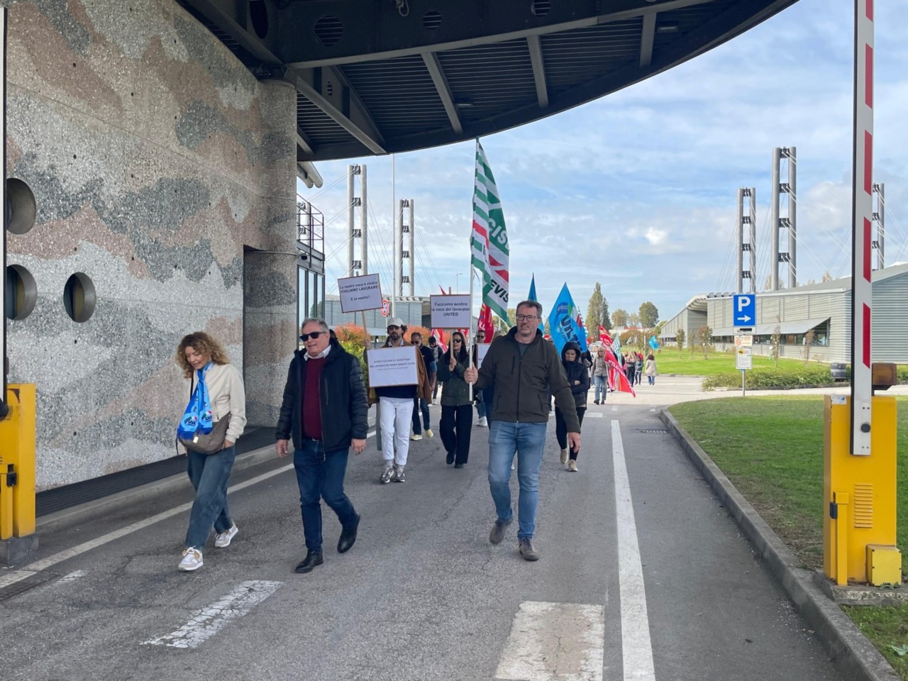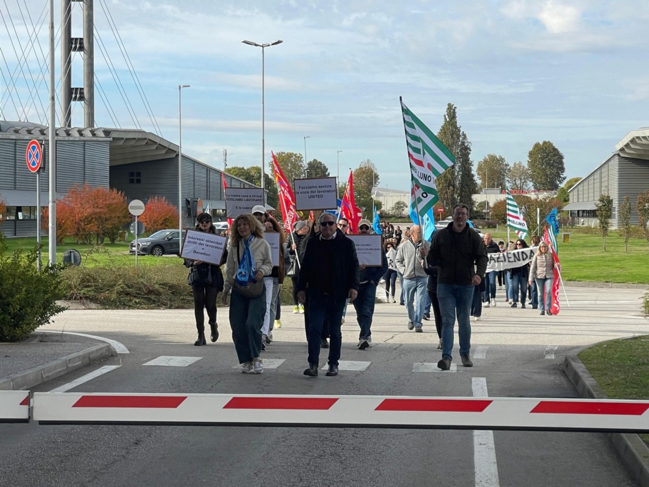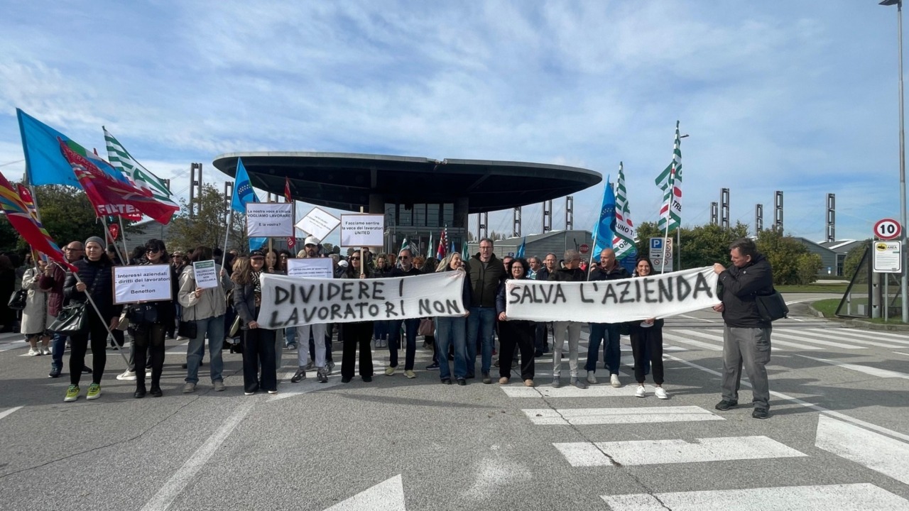 Durante la manifestazione, l’azienda ha vietato l’accesso ai giornalisti e ai fotografi all’interno dello stabilimento, costringendo i lavoratori a spostarsi lungo la strada provinciale Postumia, appena fuori dal perimetro aziendale.