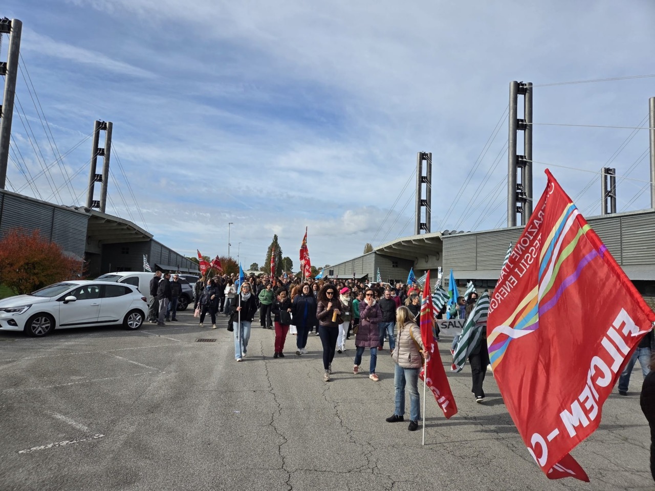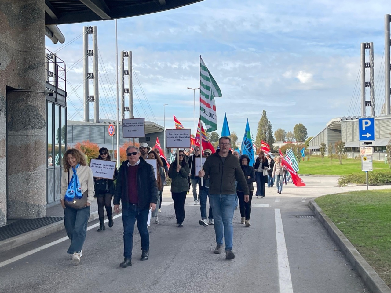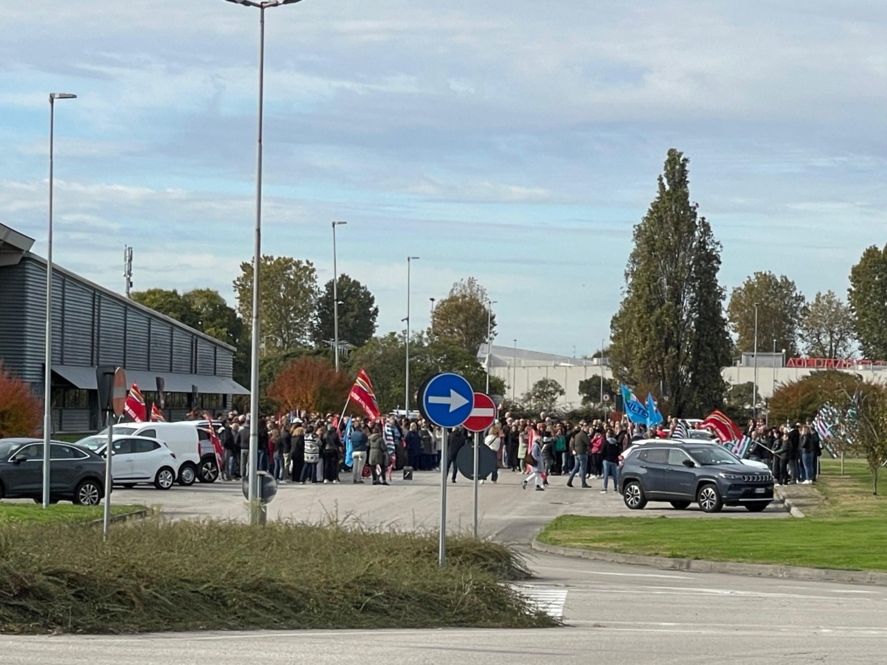 Durante la manifestazione, l’azienda ha vietato l’accesso ai giornalisti e ai fotografi all’interno dello stabilimento, costringendo i lavoratori a spostarsi lungo la strada provinciale Postumia, appena fuori dal perimetro aziendale.