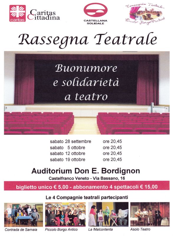 A Castelfranco, con la Caritas, anche i poveri possono andare a teatro. A Castelfranco Veneto una rassegna teatrale programmata dalla Caritas Cittadina, di concerto con la O.D.V. “Castellana Solidale”, che avrà inizio sabato 28 settembre presso il Centro Bordignon a Castelfranco Veneto. L’iniziativa è e finalizzata ad offrire alle persone/famiglie in difficoltà del nostro territorio, a cui verranno consegnati i biglietti omaggio, un’occasione per assistere ed apprezzare gratuitamente a quattro spettacoli teatrali della tradizione veneta. Per tutti gli altri partecipanti l’opportunità anche, di conoscere le iniziative della Caritas Cittadina e della Organizzazione di Volontariato “Castellana Solidale”.