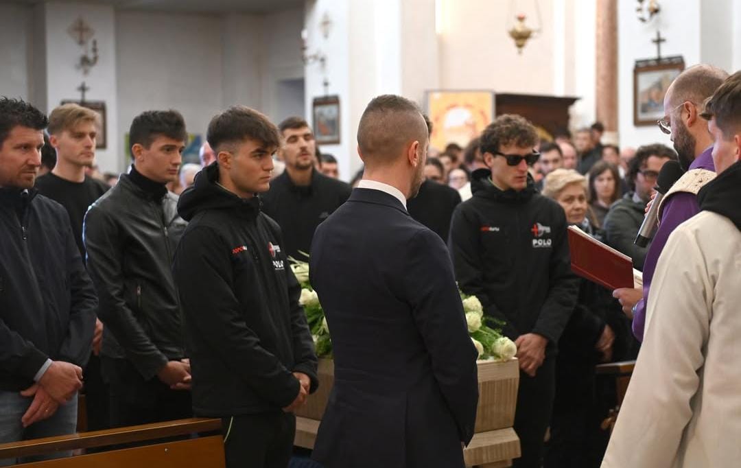 Sulla bara, i simboli di una vita dedicata al ciclismo: il casco con il numero 136, la bicicletta e la maglia della squadra. Gli amici e i compagni di squadra lo hanno accompagnato in silenzio, stringendo tra le mani i caschetti e le divise.