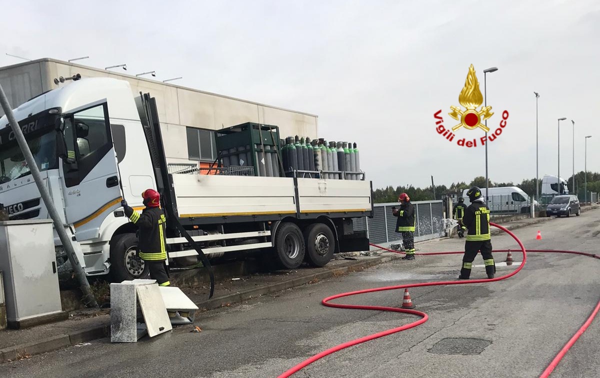 La fuoriuscita del camion che trasportava bombole di vario tipo questa mattina intorno alle 11.20 in via Marmolada. Situazione al momento sotto controllo.