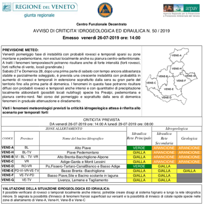 Allerta nubifragi nel Trevigiano. Dopo l’ondata di caldo previsti nel fine settimana temporali forti, allerta gialla su tutta la regione da parte di protezione civile e Arpav Regione Veneto. Attenzione già da oggi per le escursioni sulle Dolomiti, dove ci sono possibili fenomeni locali intensi. Sabato e domenica sono attesi temporali molto forti con possibili nubifragi locali, allerta gialla anche per la rete idraulica principale. Innalzata ad arancione allerta per le aree del Piave, Adige, Brenta, Dolomiti e Pedemontana.