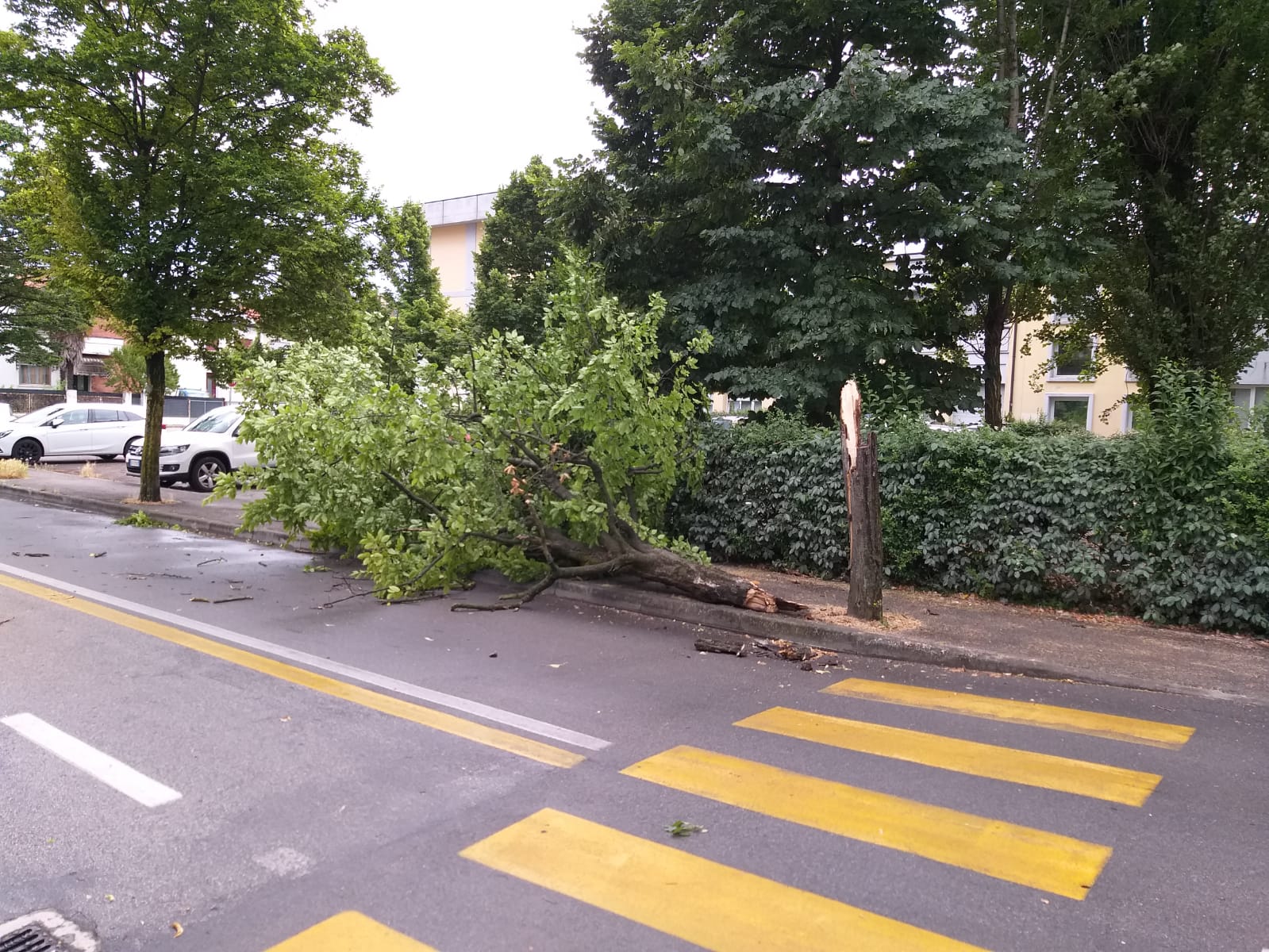 Ancora pioggia e grandine sulla Marca. Ieri sera, venerdì 21 giugno, una nuova ondata di maltempo si è abbattuta sulla Marca. Intense piogge e grandine a Montebelluna. A Castelfranco Veneto il forte vento a spezzato alcune piante. Nell’immagine una pianta spezzata in via Verdi. Oggi, sabato 22, il transito di un nucleo depressionario da Ovest porta diffusa e marcata instabilità con precipitazioni frequenti su gran parte della regione e un temporaneo sensibile calo termico. Da domenica, ma soprattutto da lunedì, il rinforzo di un promontorio anticiclonico, associato ad aria calda proveniente dall’Africa, determinerà tempo più stabile con graduale aumento delle temperature. Oggi, dunque, probabilità alta (75-100%) di rovesci o di temporali sparsi specie sulle zone montane, pedemontane e pianura centro-settentrionale; probabilità medio-alta (50-75%) altrove. Probabili fenomeni localmente intensi. Dal tardo pomeriggio/sera attenuazione e diradamento delle precipitazioni.