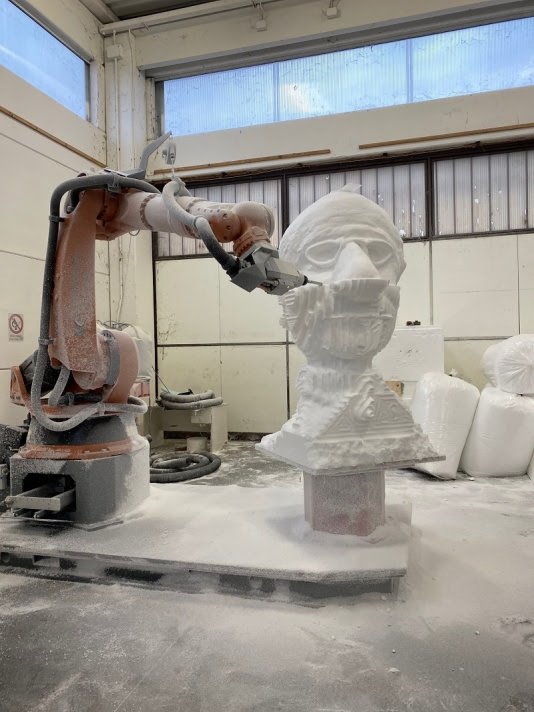 Dopo la scansione è seguita la fresatura con un braccio meccanico (ad opera di Printmateria Srl) di enormi blocchi di polistirolo che alla fine hanno generato un faccione grande quattro metri che spunta dal tetto del Museo Casa Giorgione, poggiandosi su una struttura a mo’ di teatrino realizzata da Giancarlo Baggio. Infine, i colori sono stati stesi dallo storico artista Alessandro Gatto, che conosceva Pastrello di persona e che l’agenzia Otium, che ha supervisionato il progetto, ha scelto per dare eternità all’opera. “Siamo orgogliosi di aver partecipato a questa sfida artistica”, spiega Gianfranco Caufin di 3DZ Treviso. “Il risultato è eccezionale e prova ancora una volta che la scansione 3d ha utilizzi ancora inesplorati. Pensiamo ad esempio a tutte le opere d’arte da conservare e proteggere in casi di inondazioni, come è capitato a Venezia. La memoria digitale dell’opera ne garantisce la conservazione eterna e la possibilità di una riproduzione su supporti diversi per renderla, ad esempio nel caso di Pastrello, più grande e popolare per il pubblico”.