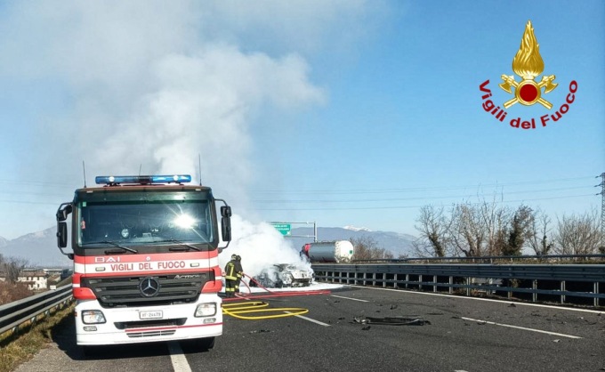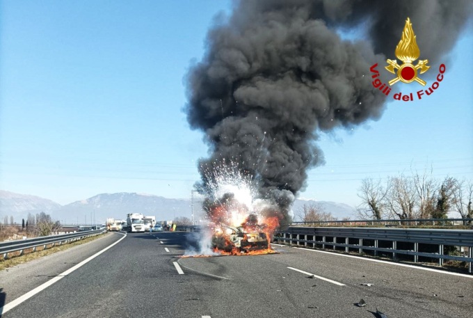 Contromano sulla A27, si scontra con un’altra auto e poi prende fuoco