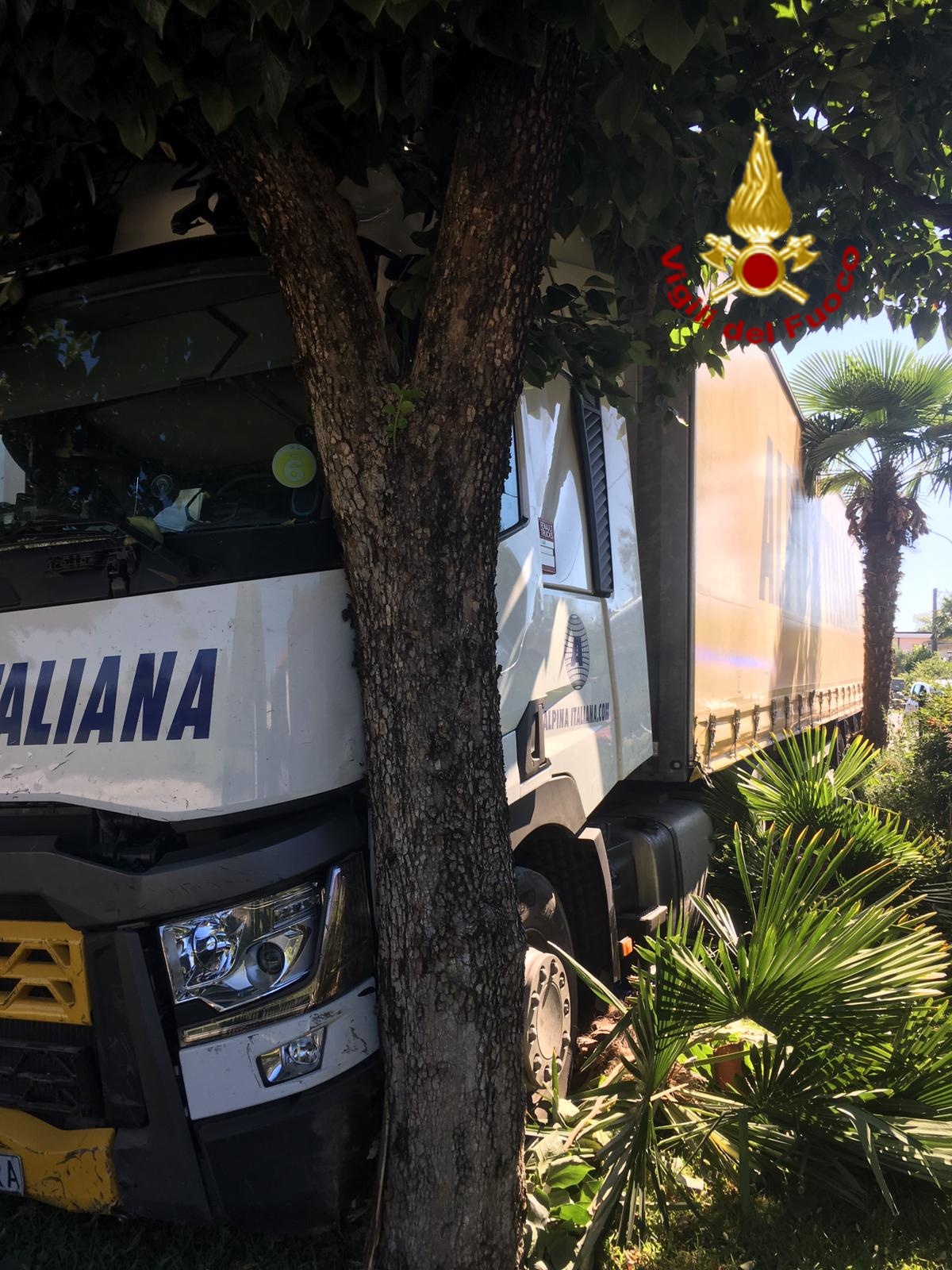 Divelta la recinzione del privato, la corsa dell'automezzo è finita contro un albero. Sul posto i Vigili del fuoco di Treviso, il 118 e la Polizia di Stato.