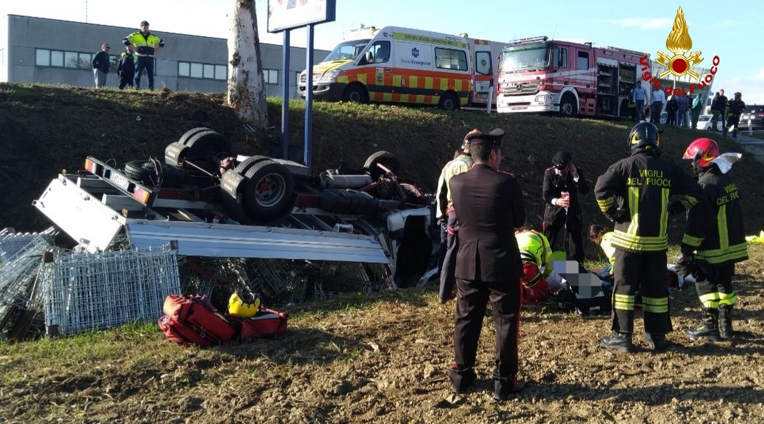 Un camion che trasportava griglie metalliche esce di strada e finisce nella scarpata.