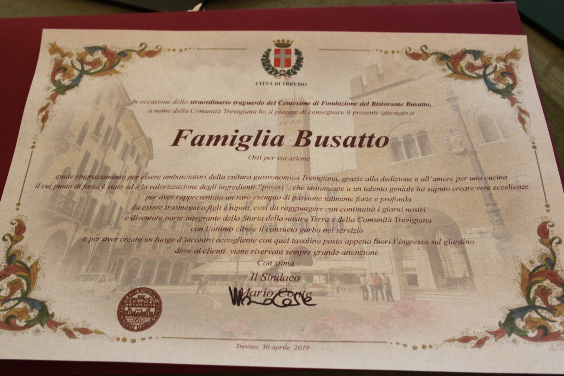 Con queste parole il Sindaco di Treviso Mario Conte ha consegnato oggi, martedì 30 aprile, ad Enos e Maria Busatto un riconoscimento per il lavoro e la dedizione con cui hanno portato avanti l’attività familiare di ristorazione che nel 2019 compie un secolo di vita. Un traguardo straordinario che la Città di Treviso ha deciso di omaggiare con un riconoscimento ufficiale premiando l’impegno, la passione e il sentimento di vera accoglienza che da sempre rende unico il locale dei Busatto.