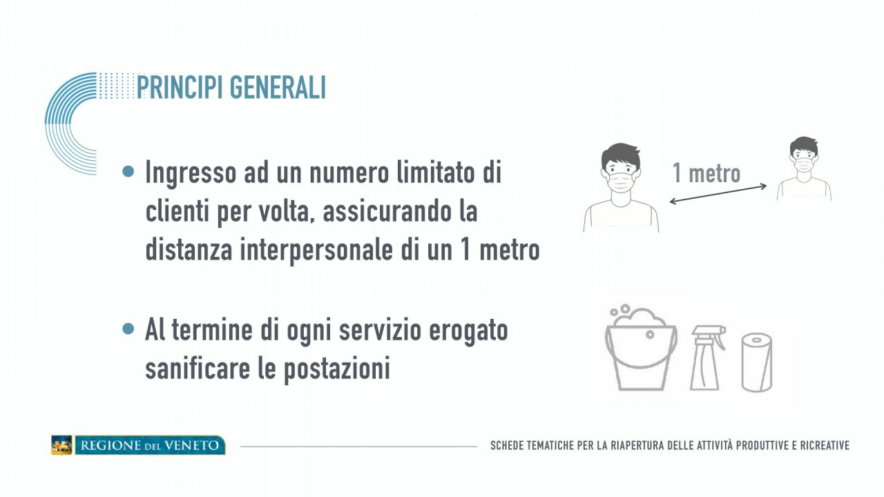 Frutto dell’intesa fra regioni e Governo in seguito all’approvazione del Decreto legge n.33 16 maggio 2020, le schede tecniche che seguono, diffuse da Regione Veneto, contengono indirizzi operativi specifici validi per i singoli settori di attività, finalizzati a fornire uno strumento sintetico e immediato di applicazione delle misure di prevenzione e contenimento di carattere generale, per sostenere un modello di ripresa delle attività economiche e produttive compatibile con la tutela della salute di utenti e lavoratori.