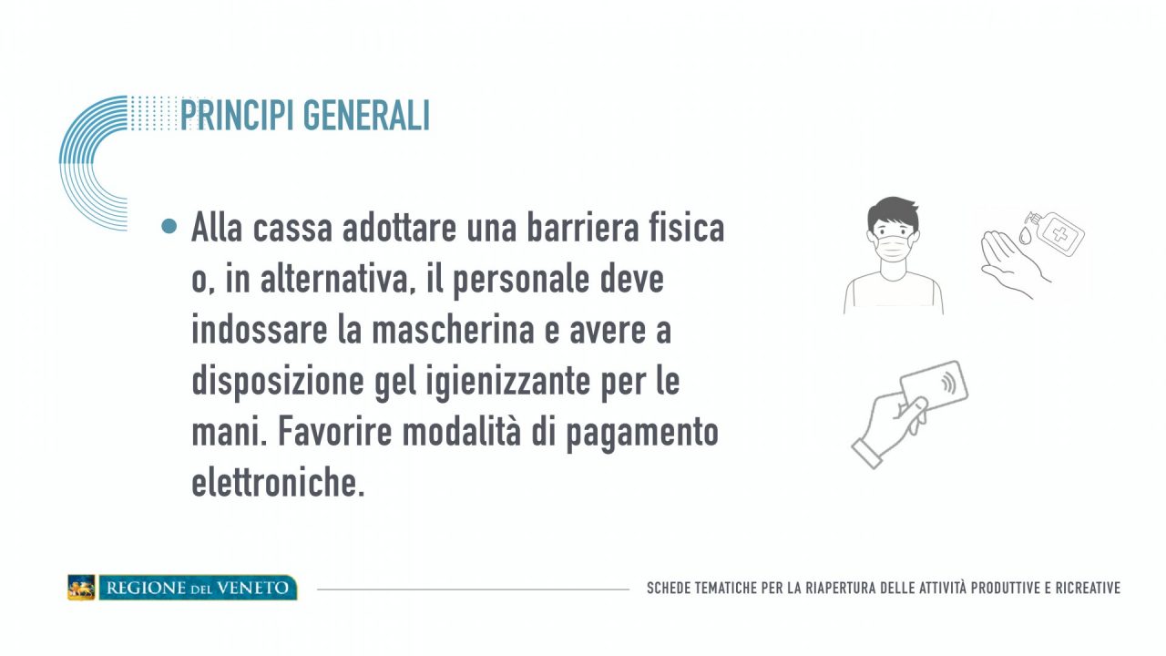 • La postazione dedicata alla cassa può essere dotata di barriere fisiche (es. schermi); in alternativa il personale deve indossare la mascherina e avere a disposizione gel igienizzante per le mani. In ogni caso, favorire modalità di pagamento elettroniche, eventualmente in fase di prenotazione.