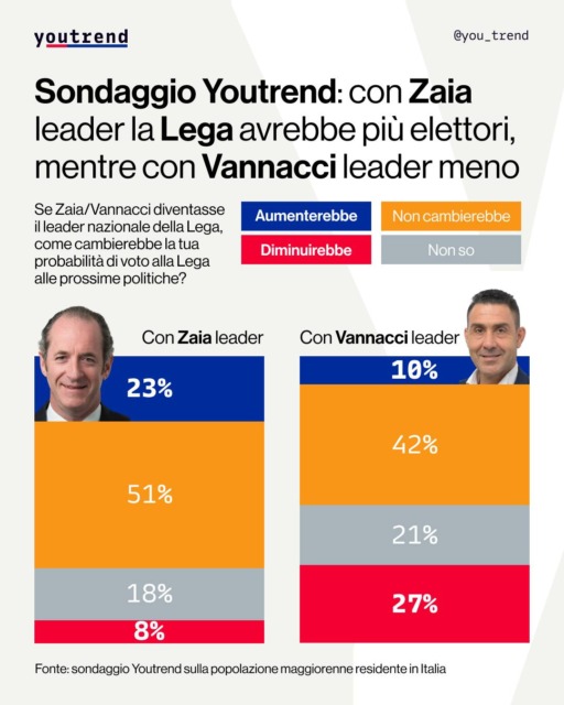 Altro aspetto che emerge dal sondaggio di Youtrend, ecco come cambierebbe la probabilità di scegliere la Lega alle prossime Politiche se Zaia diventasse leader nazionale del partito: per il 23% degli intervistati aumenterebbe, per il 51% rimarrebbe la stessa e solo per l’8% diminuirebbe.