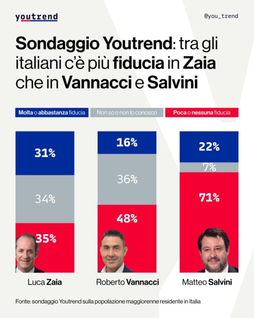 Intanto, da un sondaggio nazionale di Youtrend, su un campione di 800 intervistati, gli italiani hanno più fiducia in Zaia, il 31%. Seguono Salvini al 22% e Vannacci al 16%.