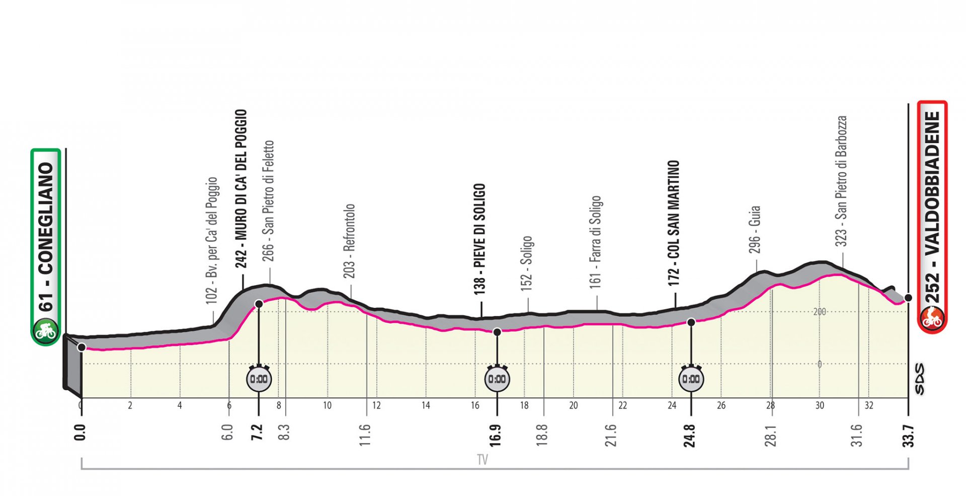 14/a tappa sabato 23 maggio: Conegliano-Valdobbiadene, 33.7 km, cronometro individuale.