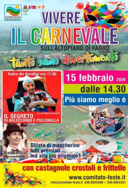 Il comitato Festeggiamenti di Farrò di Follina, vi aspetta domenica 15 febbraio, dalle ore 14:30 sull’altopiano di Farrò per festeggiare in compagnia il Carnevale.