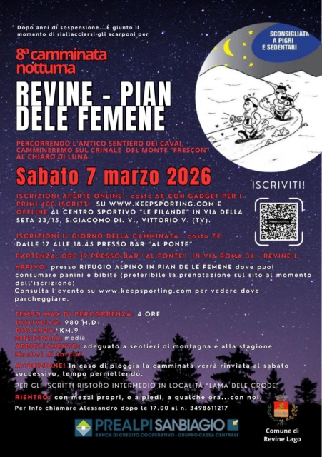 L’ottava edizione della manifestazione podistica notturna si svolge sabato 7 marzo 2026 con partenza alle ore 19:00 dal Bar Al Ponte di Revine Lago. L’itinerario prevede un percorso di 9 chilometri con un dislivello positivo di 980 metri, per una durata massima stimata in quattro ore. L’organizzazione classifica l’escursione con una difficoltà media e impone l’obbligo della torcia per tutti i partecipanti.