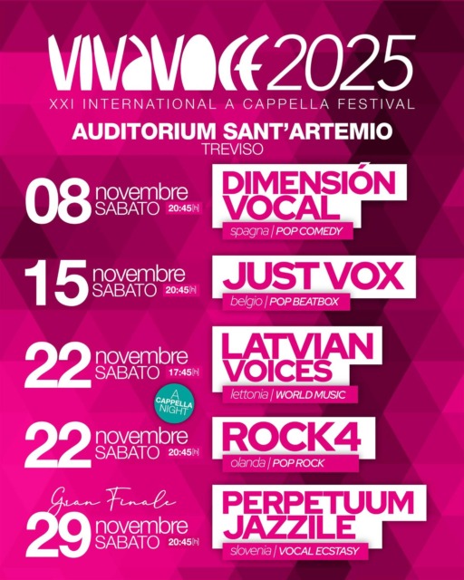 Il 22 novembre due appuntamenti: alle 17:45 dalla Lettonia arrivano i Latvian Voices con un repertorio che spazia da creative trascrizioni di musica classica alla world music, fino al pop; segue alle 20:45 l’esibizione del gruppo vocale olandese Rock4 con l’esecuzione integrale, a cappella, del leggendario album dei Queen, “A Night At The Opera”. Il 29 novembre chiude la rassegna il gruppo sloveno che ha ridefinito il suono a cappella, i Perpetuum Jazzile.