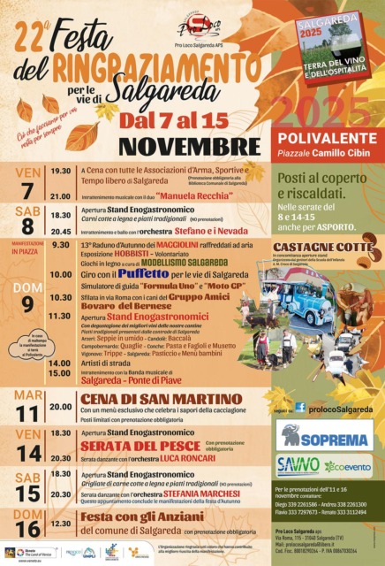 Dal 7 al 15 novembre 2025, le vie e la piazza di Salgareda accoglieranno la ventiduesima edizione della Festa d’Autunno e del Ringraziamento. L’evento celebra i frutti della terra, la buona tavola e lo spirito di comunità, trasformando il centro del paese in un luogo di incontro tra tradizione, musica e convivialità.
